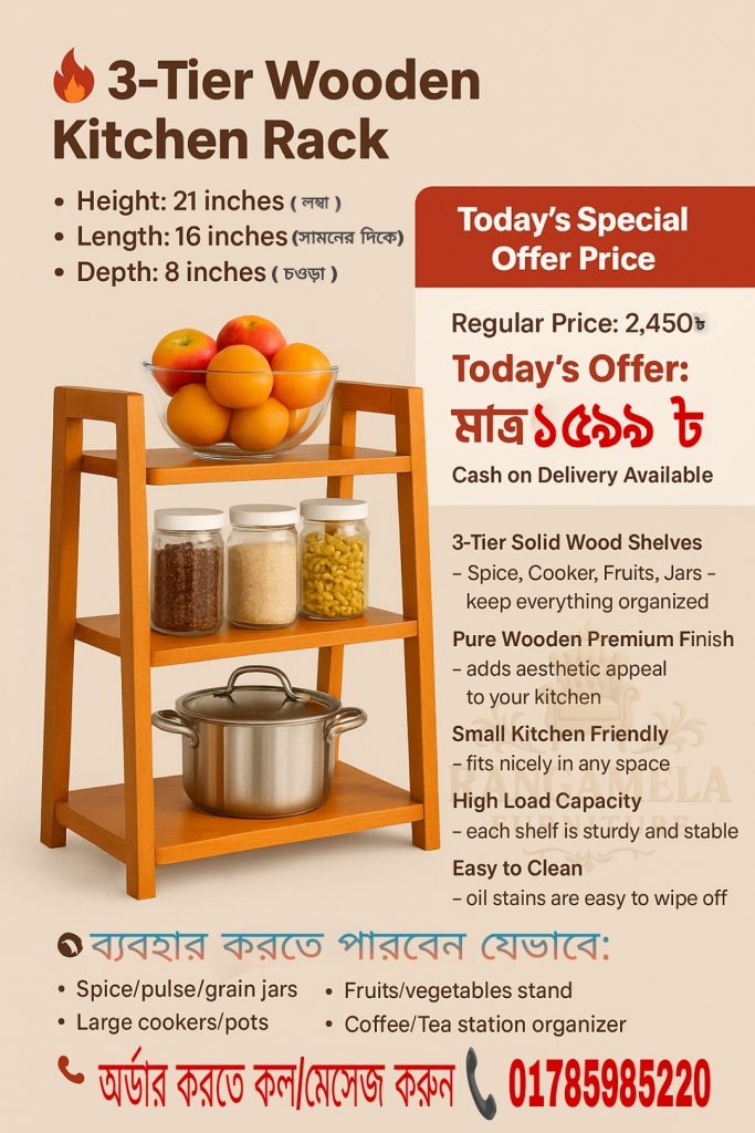 আপনার বাসার কিচেনকে দিন একটি আধুনিক, গুছানো ও প্রিমিয়াম লুক। রঙ্গমেলা ফার্নিচার – এর মাল্টিপারপাস কিচেন অর্গানাইজার তৈরি হয়েছে উচ্চমানের কাঠ দিয়ে,যা আপনার ঘরের সৌন্দর্য বাড়ানোর পাশাপাশি দীর্ঘস্থায়ী ব্যবহার নিশ্চিত করে!